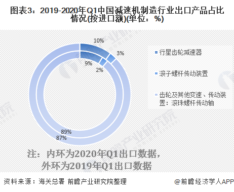 近年來,除“齒輪及其他變速、傳動裝置:滾珠螺桿傳動軸”外,其余產品的出口份額均有所下降。2020年第一季度,“齒輪及其他變速、傳動裝置:滾珠螺桿傳動軸”的出口額占到了中國減速機制造行業(yè)出口產品總出口額的89%。